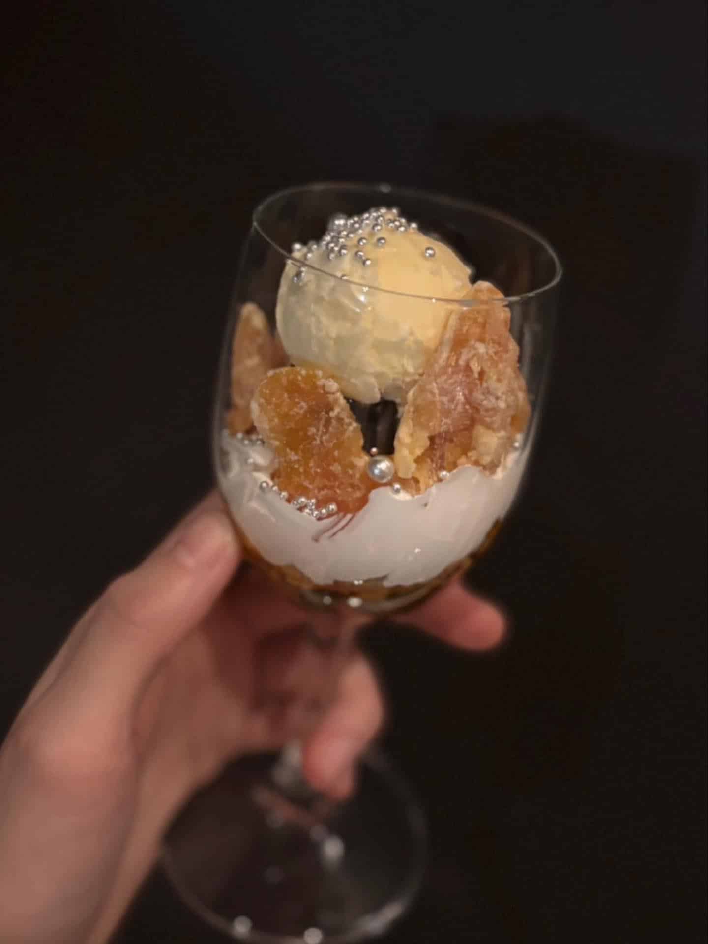 A reward parfait for adults with an irresistible combination of dried orange, rich chocolate sauce, and vanilla ice cream.