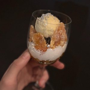 A reward parfait for adults with an irresistible combination of dried orange, rich chocolate sauce, and vanilla ice cream.