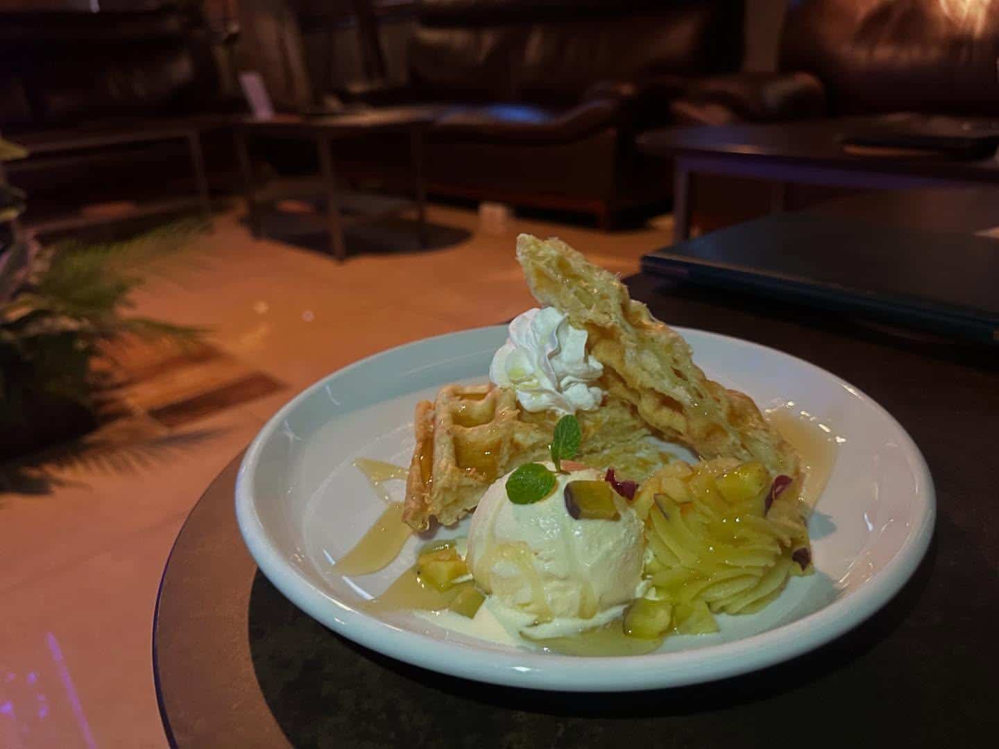 外はサクッと、中はしっとりと仕上げた季節のクロッフルに、スイートポテトのやさしい甘さを合わせました。香ばしい生地と、ほっくりとしたさつまいもの風味が相性抜群で、シーシャと一緒に楽しむデザートとして人気の一品です。落ち着いた空間で、季節の味わいをゆっくりお楽しみください。