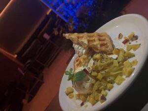 外はサクッと、中はしっとりと仕上げた季節のクロッフルに、スイートポテトのやさしい甘さを合わせました。香ばしい生地と、ほっくりとしたさつまいもの風味が相性抜群で、シーシャと一緒に楽しむデザートとして人気の一品です。落ち着いた空間で、季節の味わいをゆっくりお楽しみください。