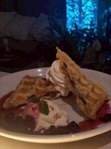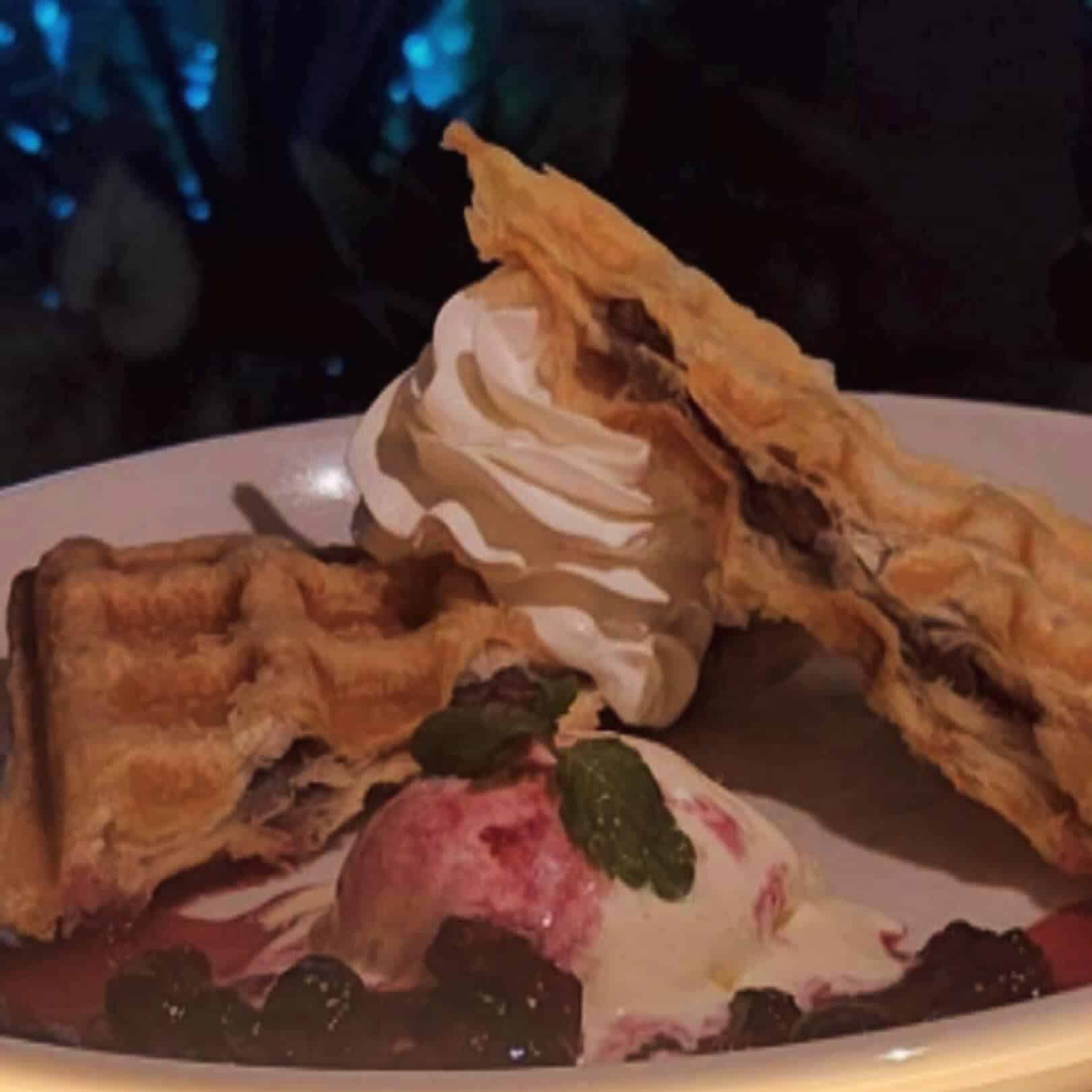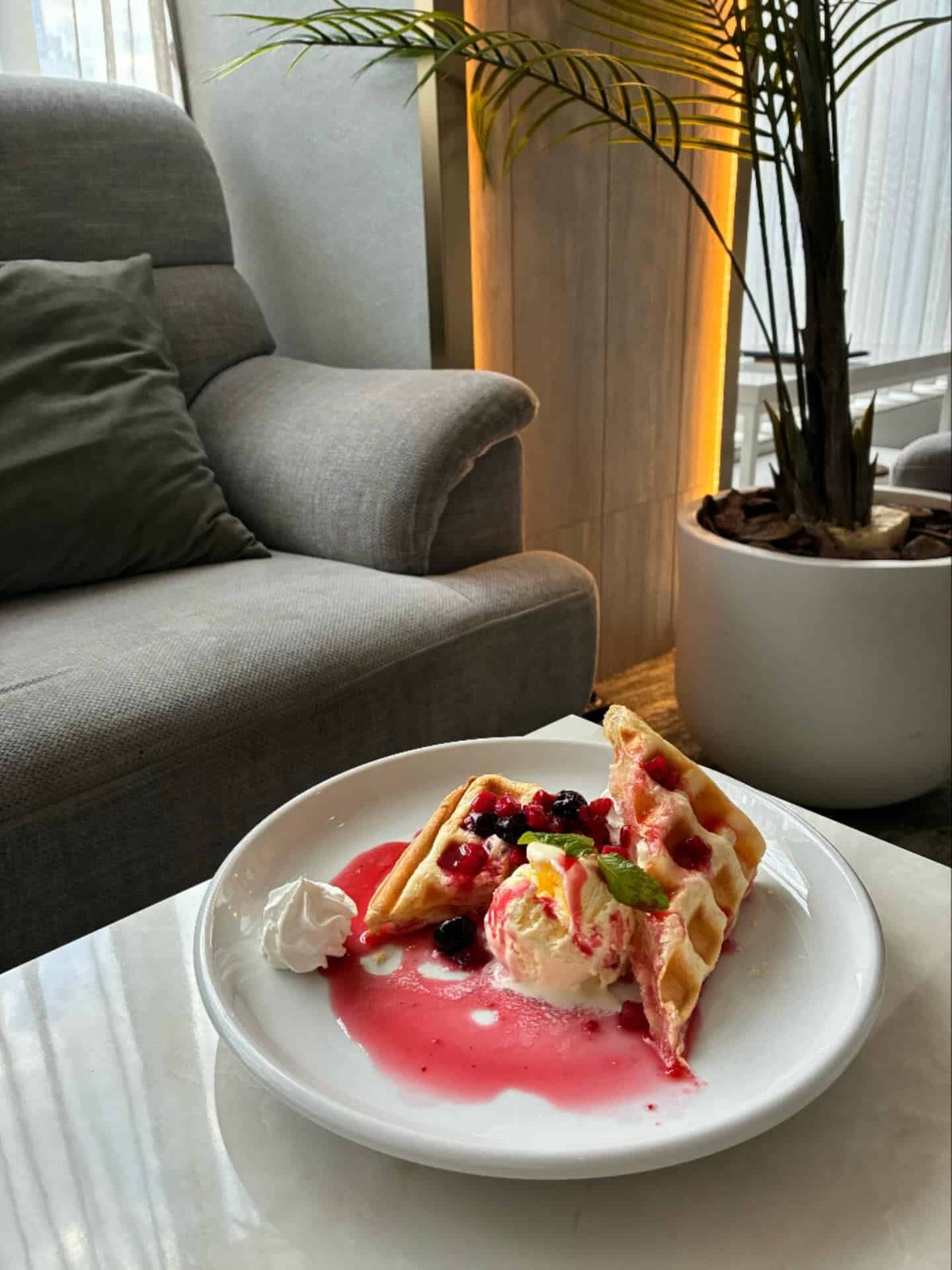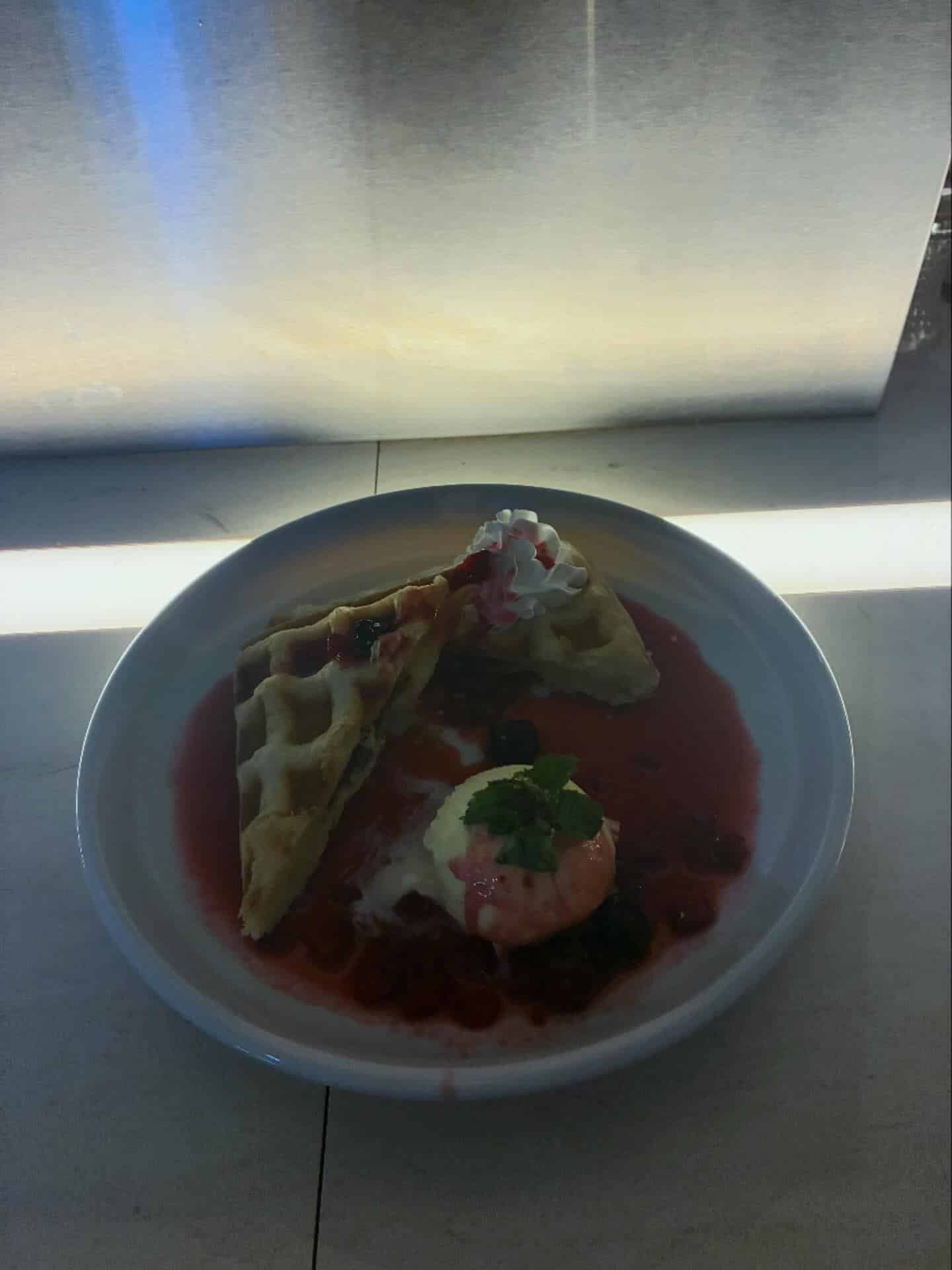 旬のベリーとベリーソース、チョコレートと一緒に焼き上げたクロッフル生地そしてバニラアイスのハーモニーを楽しめる一皿