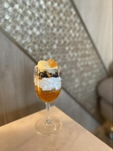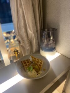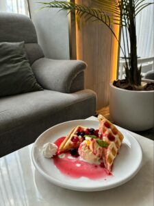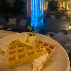 焼きたてのクロッフル生地に濃厚なさつまいもクリーム、食感が楽しめるさつまいもそしてバニラアイスのハーモニーを楽しめる一皿
