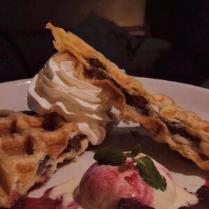 旬のベリーとベリーソース、チョコレートと一緒に焼き上げたクロッフル生地そしてバニラアイスのハーモニーを楽しめる一皿