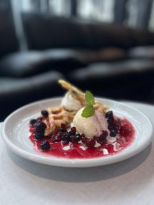 サクサクもちもちの生地にクーベルチュールをサンドし、甘酸っぱいベリーソースをかけた特別感のあるデザートです。
