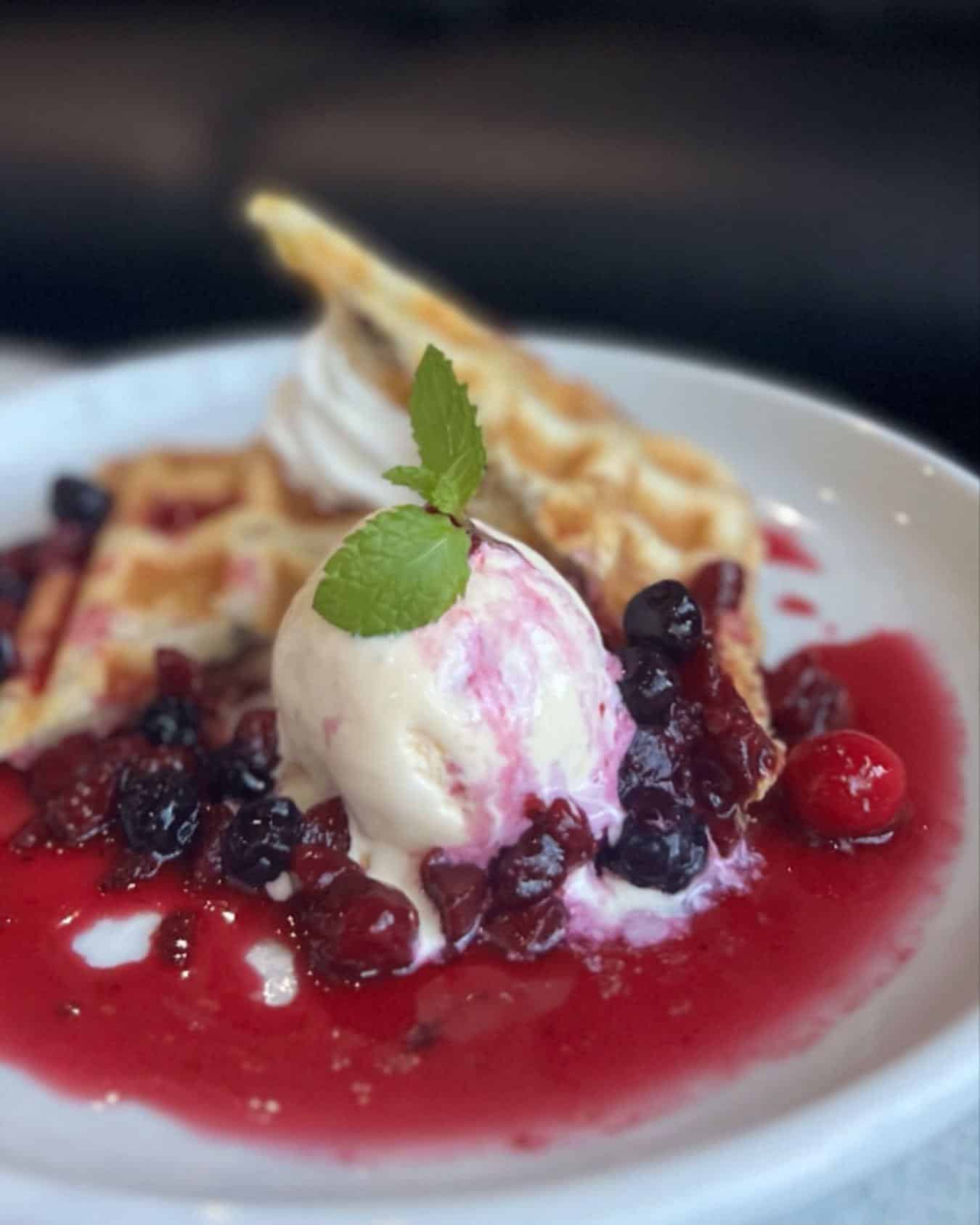 贅沢なワッフルに、バニラアイスと鮮やかなベリーソースをたっぷりトッピング。ミントのアクセントが爽やかさを加え、甘酸っぱさとクリーミーさが絶妙に調和したデザートです。