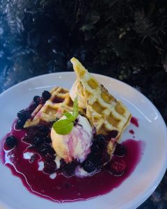 贅沢なワッフルに、バニラアイスと鮮やかなベリーソースをたっぷりトッピング。ミントのアクセントが爽やかさを加え、甘酸っぱさとクリーミーさが絶妙に調和したデザートです。