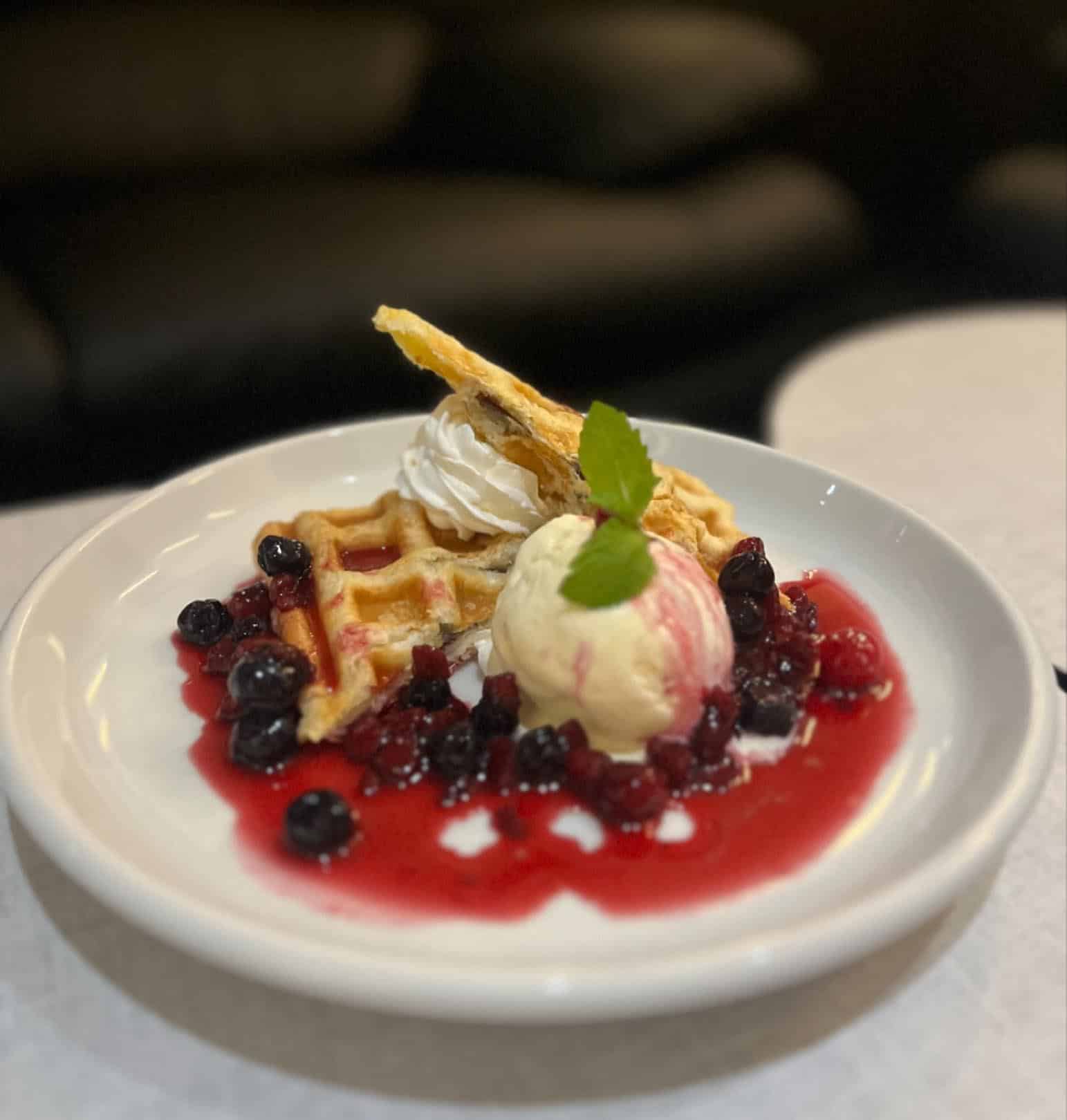 こちらは当店のオリジナルデザート「季節のクロッフル」でございます。サクサク・もちもちの生地にクーベルチュールをサンド。甘酸っぱいベリーソースで甘すぎない味わいとなっております。当店の「塩キャラメルワッフル」と共に大人気の一品です。ぜひご賞味ください。