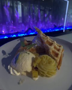 サクサクのクロッフルに、滑らかなさつまいもペーストをたっぷり絞り、ハチミツをかけて甘さとコクをプラス。中央のバニラアイスが冷たいアクセントとなっています。