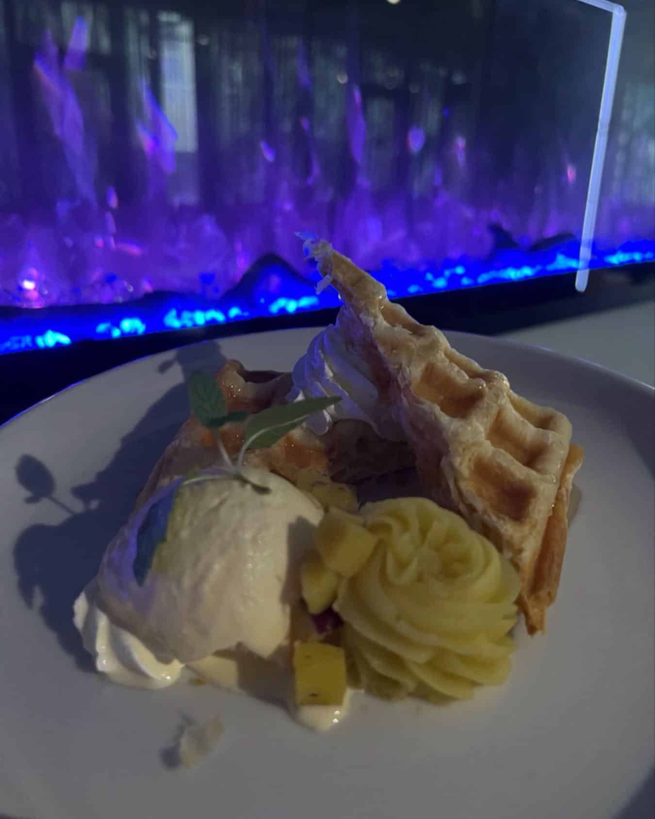 サクサクのクロッフルに、滑らかなさつまいもペーストをたっぷり絞り、ハチミツをかけて甘さとコクをプラス。中央のバニラアイスが冷たいアクセントとなっています。