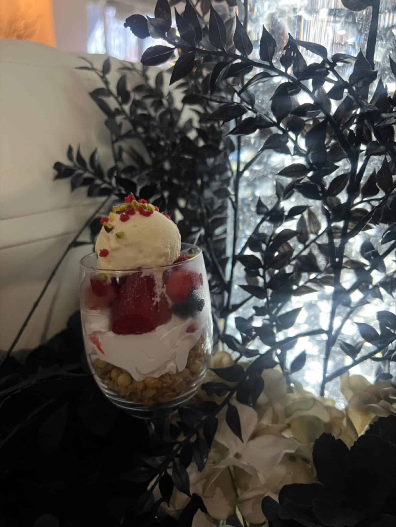 当店の定番デザート、贅沢ベリーパルフェ。新鮮なベリーとふわふわクリームがたっぷりと入った贅沢な一品。優雅なひとときをシーシャと共に楽しんでみませんか。ぜひご賞味ください。