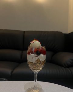当店の定番デザート、贅沢ベリーパルフェ。新鮮なベリーとふわふわクリームがたっぷりと入った贅沢な一品。
